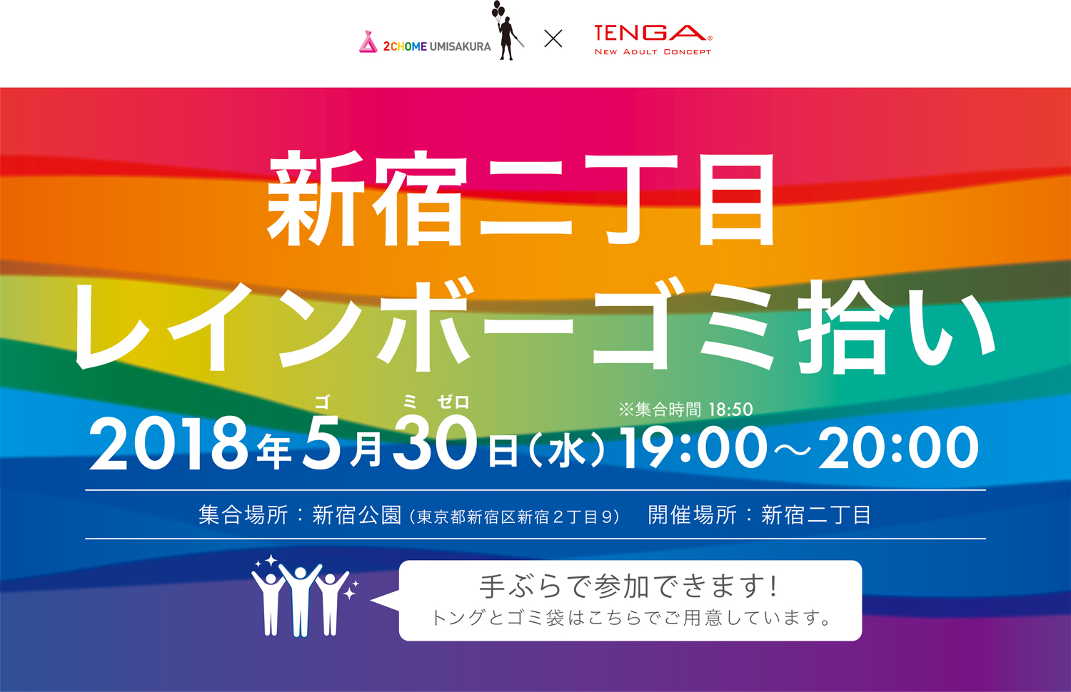 株式会社TENGA (東京都港区/代表取締役社長 松本光一)は、5月30日の“ごみゼロの日”に、新宿二丁目のクリーン活動をしている「二丁目海さくら」に協賛し、「新宿二丁目レインボーゴミ拾い supported by TENGA」を開催いたします。